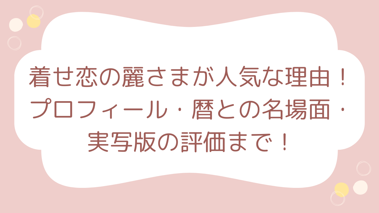 マンガ着せ恋のれいさまが人気な理由!プロフィール・暦との名場面・実写版の評価まで! 「その着せ替え人形は恋をする(着せ恋)」の中でも、圧倒的な人気を誇るキャラクターが麗さま(鴻上麗)です。完璧な生徒会長であり、夜はNo.1ホストという二面性を持つ彼女は、華やかさだけでなく弱さや人間味を見せるギャップで多くのファンを魅了して... 2025.09.03マンガ