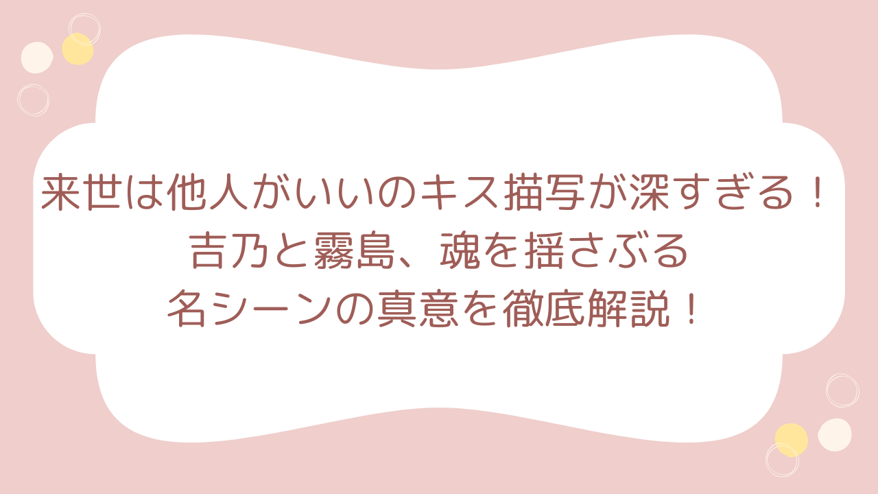 来世は他人がいいに登場する吉乃と霧島、その二人が交わすキスの一つ一つが、まるで人生そのものの縮図のように描かれています。